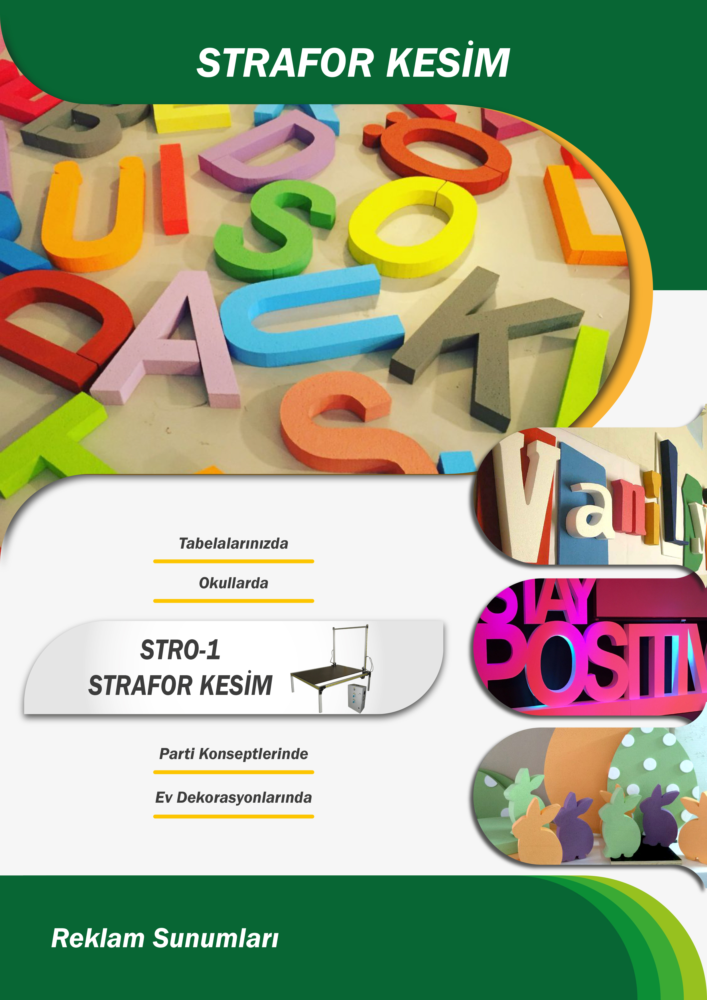 Strafor, Köpük adı alan bu malzeme bilgisayarlı, strafor kesme, köpük kesme, sistemleri ile strafor harf, köpük harf, strafor dekor, köpük dekor, yalıtım amaçlı ya da paketleme malzemesi olarak kullanım alanlarına sahiptir, köpük kesimi sıcak tel tarafından hassas bir şekilde pürüzsüz olarak kesilir ve müşterinin talep ettiği renge ve konuma göre boyanır