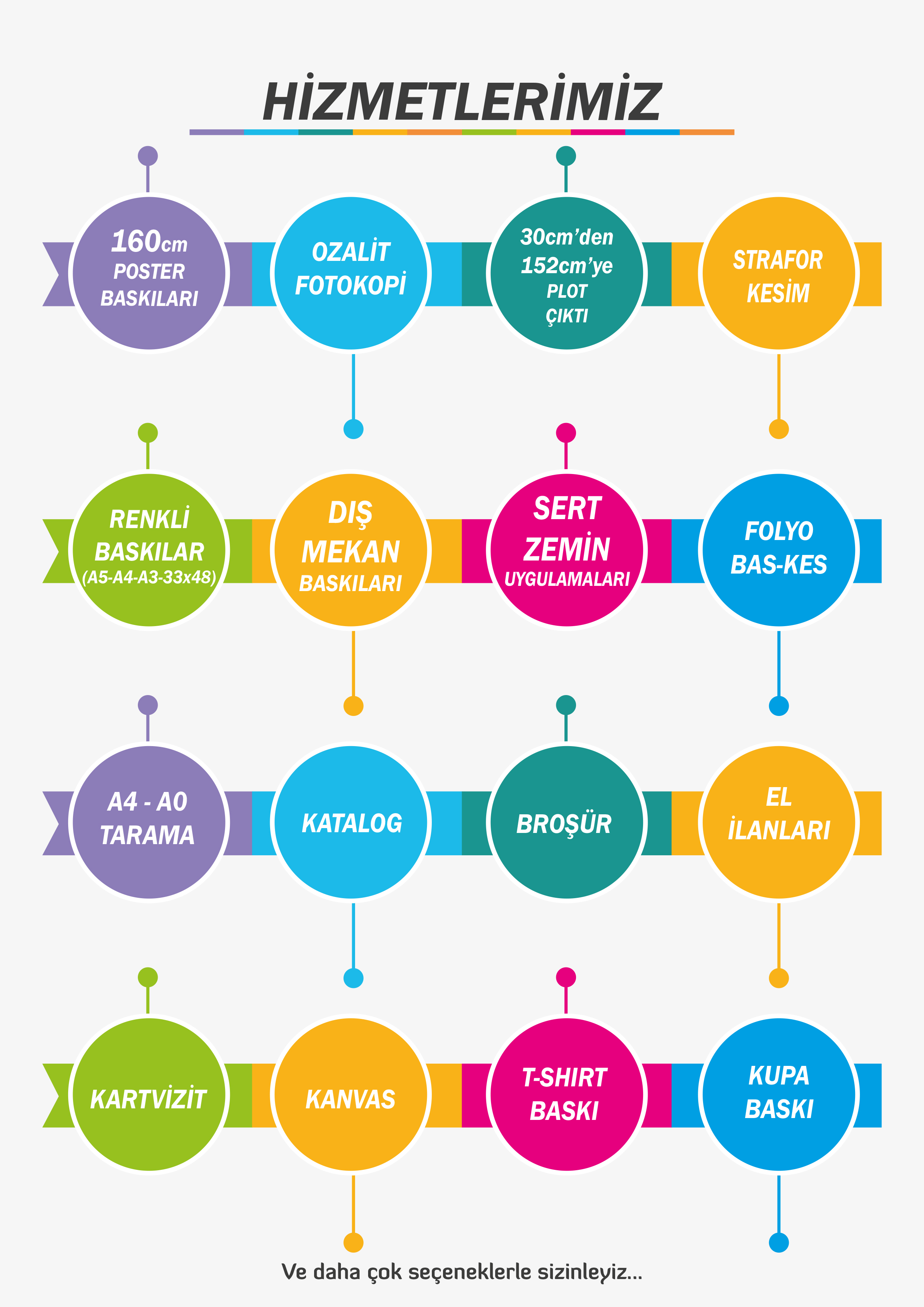 • 30cm'dn 152cm'ye kadar renkli veya siyah/beyaz proje baskıları ve kopyalama.1.Hamur ve Kuşe Kağıt Seçenekleri ve 80gr.-350gr. Renkli ÇıktılarAydınger ,Sticker Baskılar.