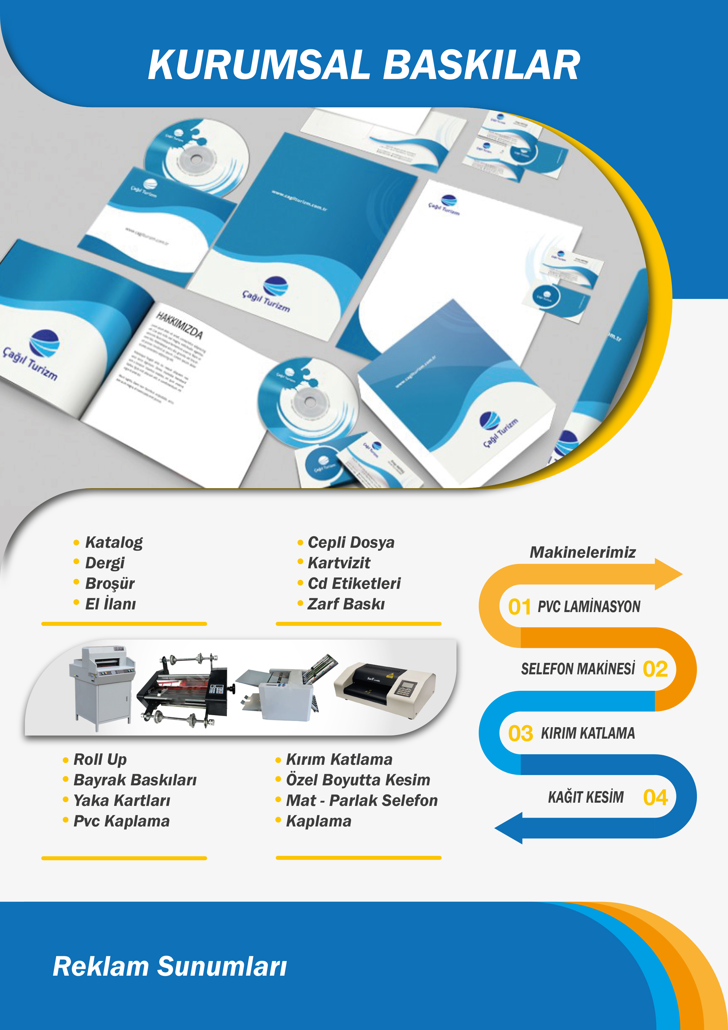 Her ölçekteki firmanın Rulo, Kartvizit, Zarf, Antetli Kağıt gibi belli başlı baskı ihtiyaçları vardır. Bu kurumsal baskı ihtiyaçları firmanın bulunduğu sektöre ve pazarlama stratejisine göre değişiklik gösterebilir. Firmaların baskı ürünlerinin temin edilmesindeki en büyük kaygıları uygun fiyat, yüksek kalite ve kolaylıktır..